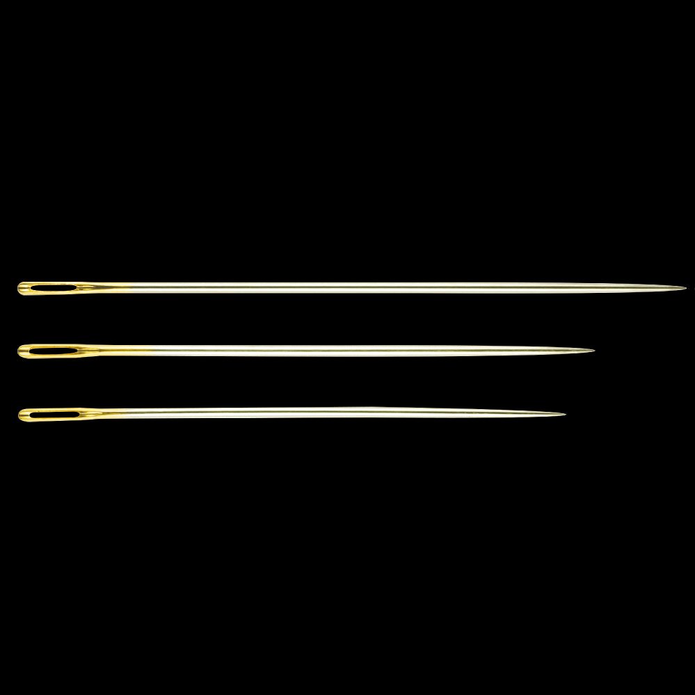 3 needles / pack. Superior sewing needles go through fabric smoothly without straining or stress. Unique, pure gold plate elliptical eye is helpful for threading. Nickel plated tip for smooth sewing. Durable and bend resistant.