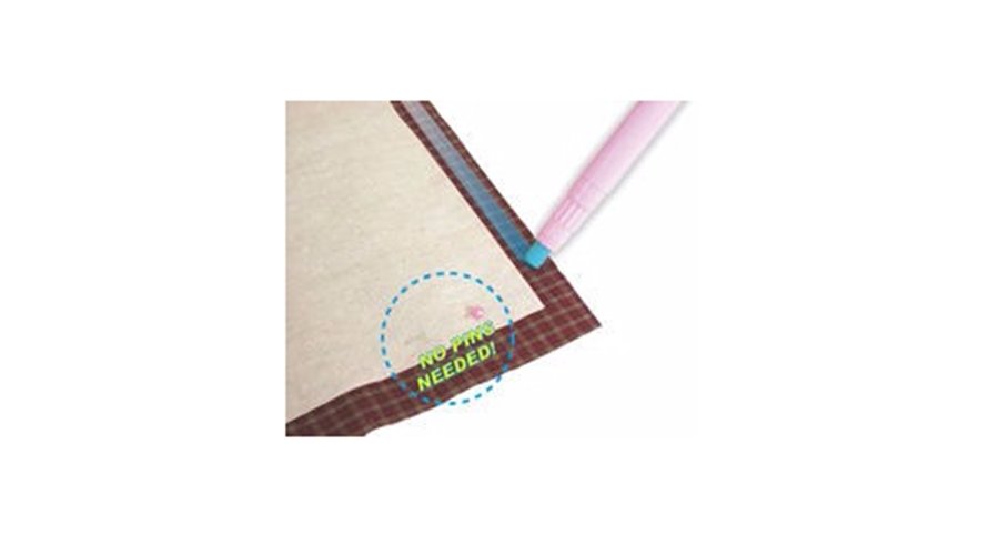 Just run the glue pen along the fabric edge, hold the pieces together and you have a temporary bond. Goes on coloured, dries clear. Washes out and will not gum up your needle.