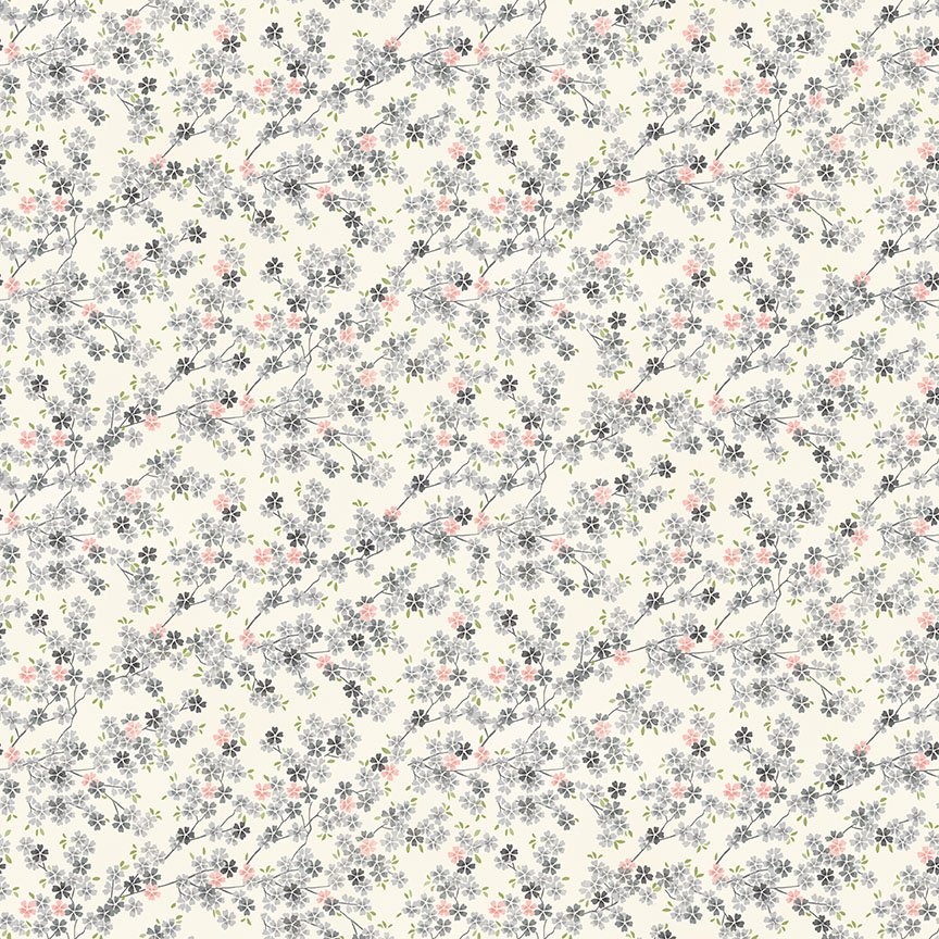 Five designs in subtle soft greys, dusty pinks and gentle blues work together in a collection of small ditsy prints.
