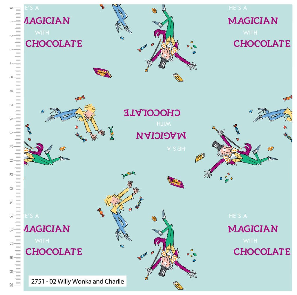 A printed cotton fabric featuring several charming Charlie and The Chocolate Factory designs.